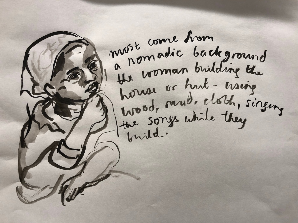 To begin with, we all listened to the magnificent voice and music of iconic Somali singer Maryam Mursal . I drew her from a video clip and wrote down some of what she said, as well as what was said about her, by the people gathered for the session. Over subsequent weeks we listened together to lullabies, house building songs, herding songs and other examples of Somali music.