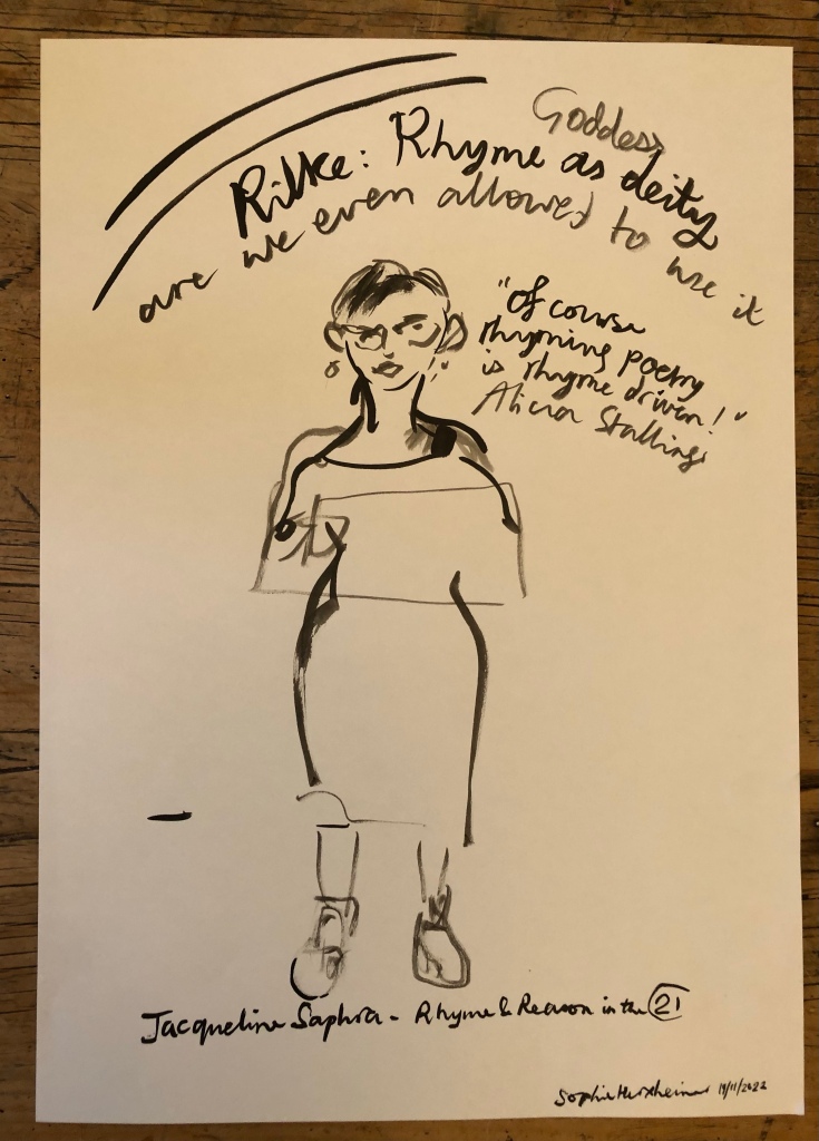 Jacqueline gave an inspiring talk on rhyme, which she packed with dazzling examples from some of her favourite poems. I drew what I could catch – trying not to get so absorbed that I forgot to move my brush across the paper.